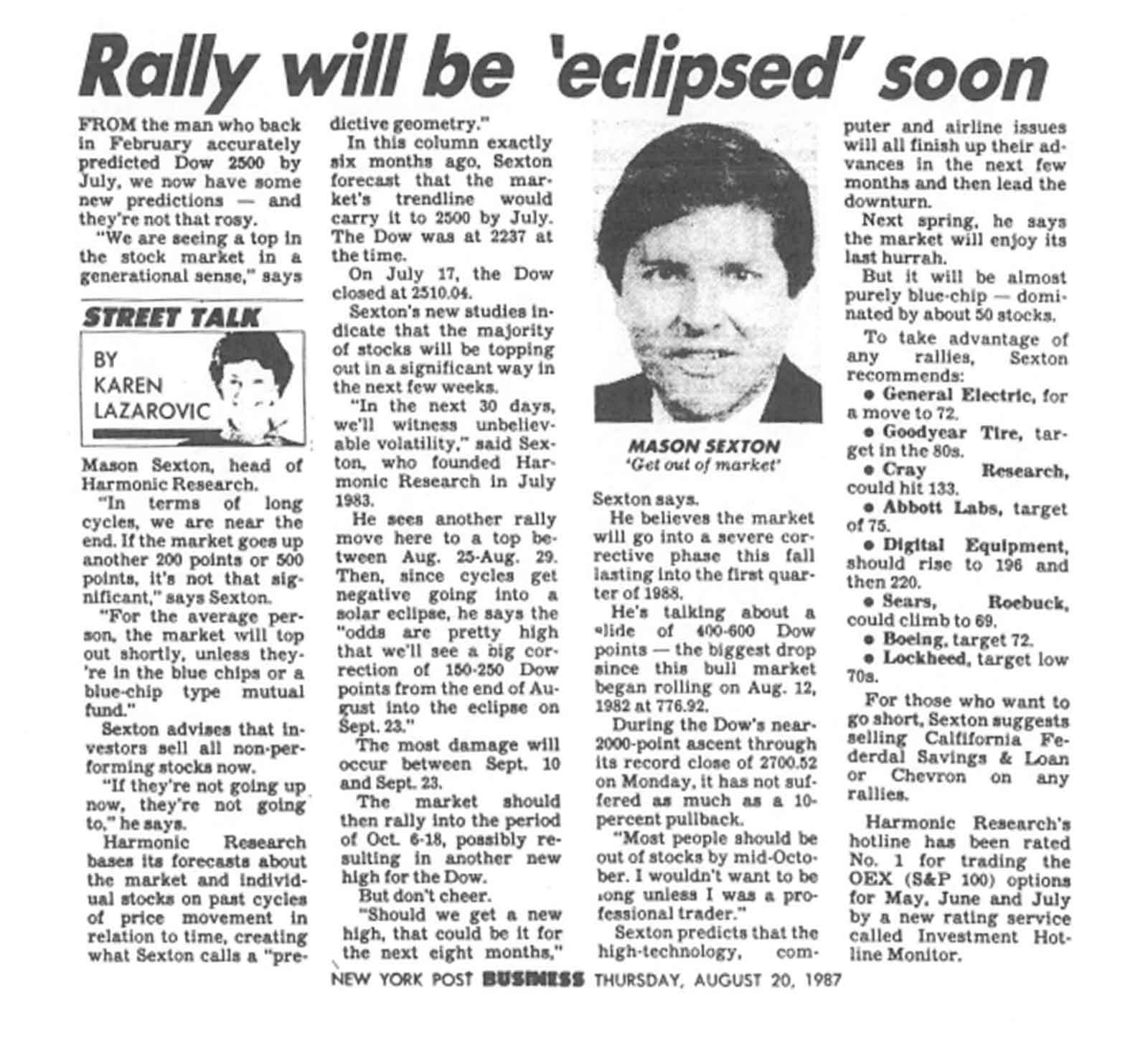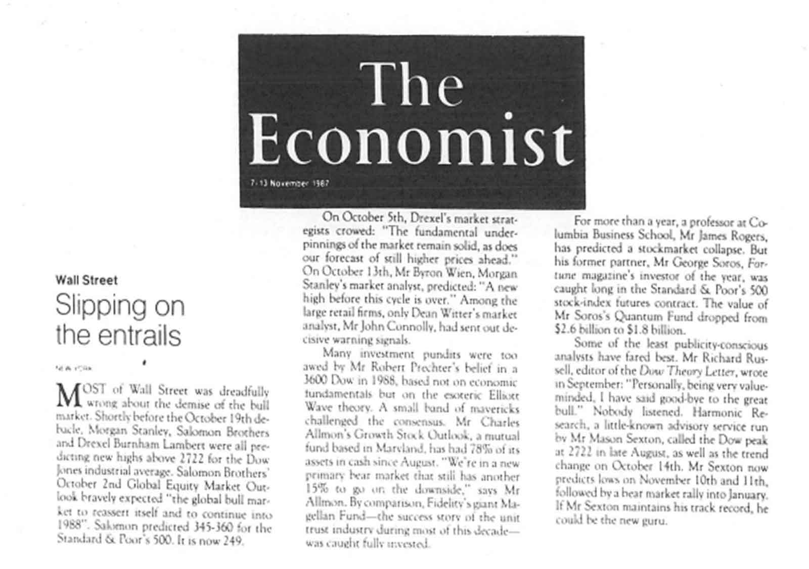 He received worldwide attention for his uncanny prediction of the 1987 stock market crash, which he warned about on at least 7 different occasions in advance.