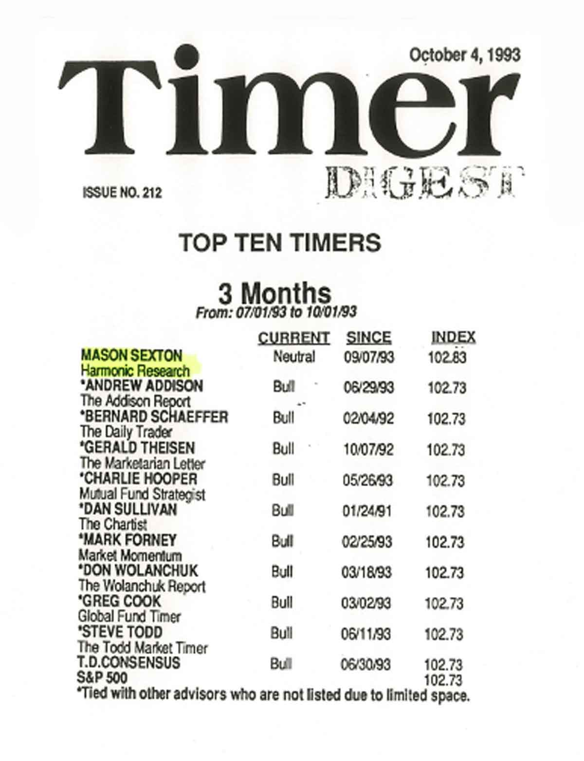 He was named a “Top 10 Timer” by Timer Digest in 1987, 1988, 1989, 1990, 1992 1993, and 1994—when he made the cover.
